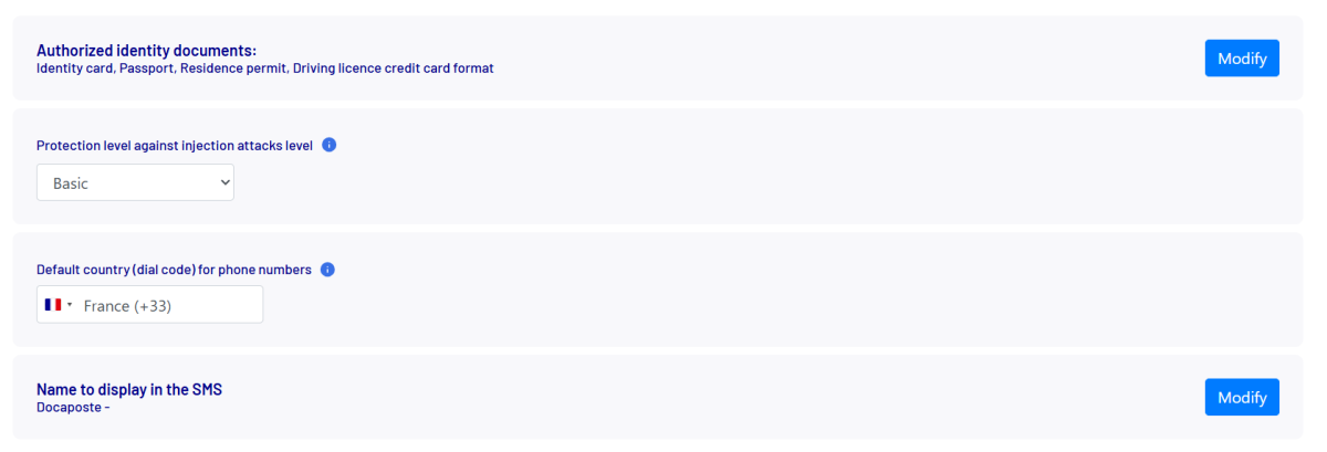 This section allows you to add fields that the user must manually fill in. In API mode, it is possible to send fields such as first name, last name, and date of birth. This information will then be compared with data extracted from identity documents or provided by external electronic identification methods such as La Poste Digital Identity.