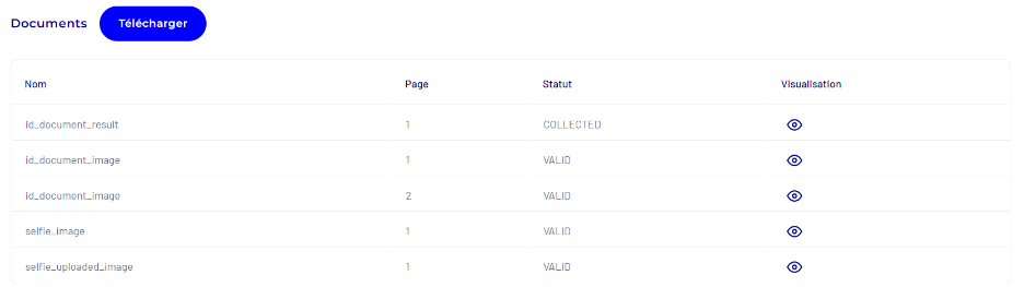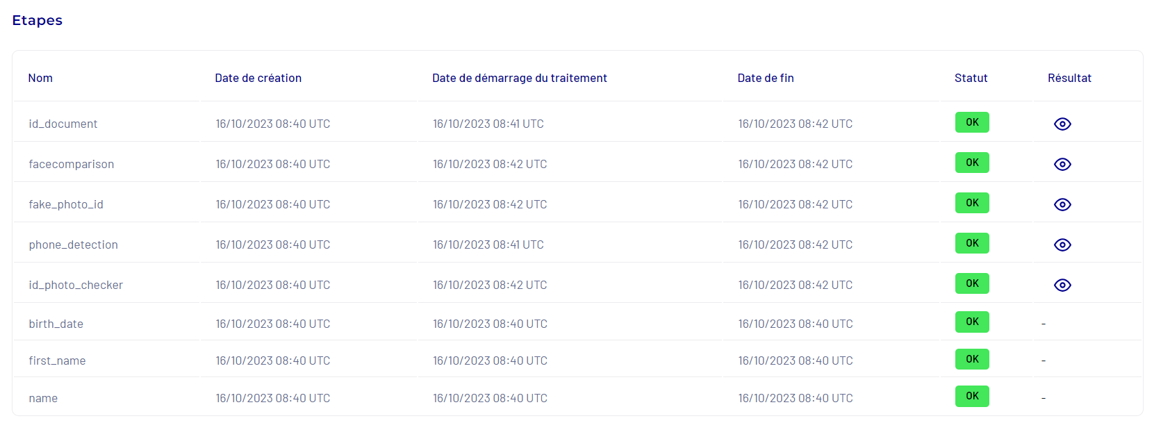 Id_document: The identity document is considered valid (OK). The information was successfully extracted and can be viewed by clicking the eye icon in the “Result” column.