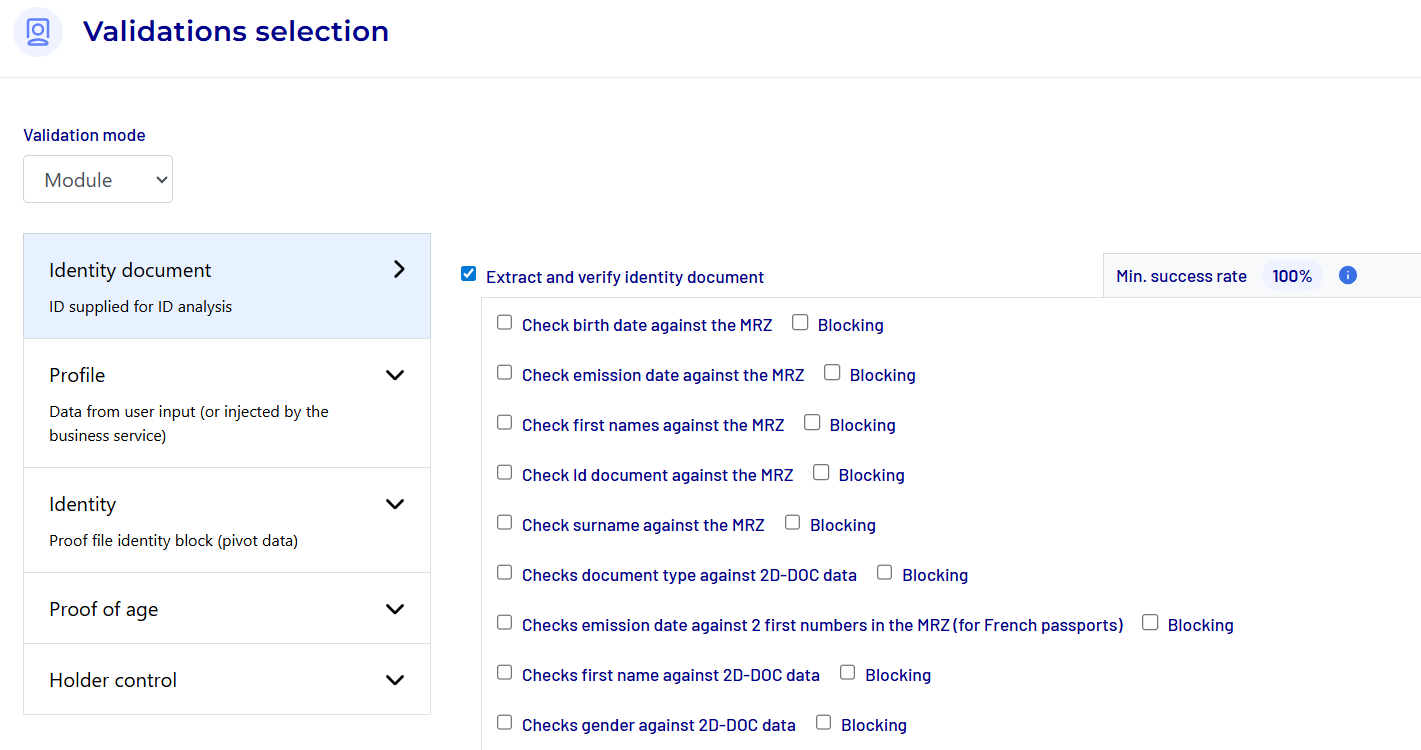 This section allows you to customize all the checks you wish to perform on identity documents or on data retrieved from External Identity Modules (EIMs).