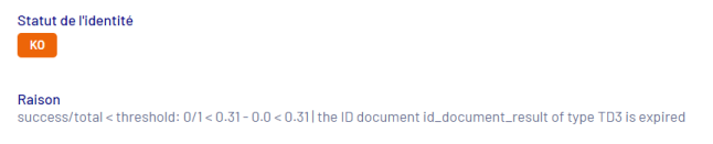 Dans cet exemple, le taux de réussite défini dans le parcours n'a pas été atteint et la pièce d'identité est arrivée à expiration. Pour consulter la liste complète des codes d'erreur et leurs significations, veuillez cliquerici